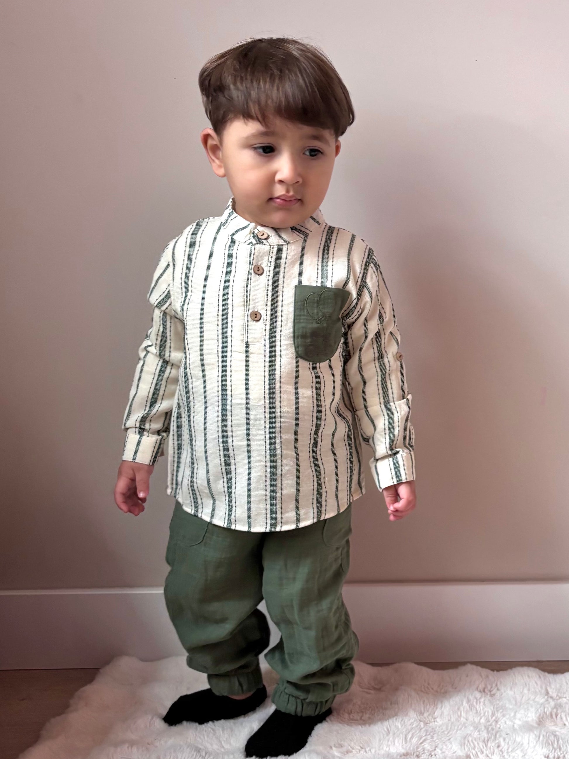 Een stoere, comfortabele set van 100% katoen, met een zachte blouse en groene broek met elastische broekpijpen.