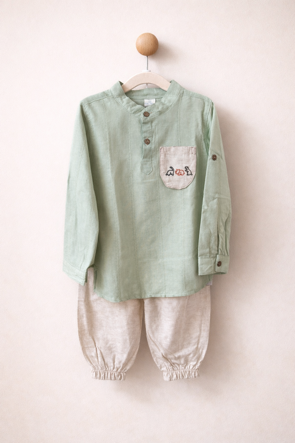 Een stoere, luchtige set van 100% katoen, met een lichtgroene blouse met een schattig dinosaurusborduurwerk en een beige broek.