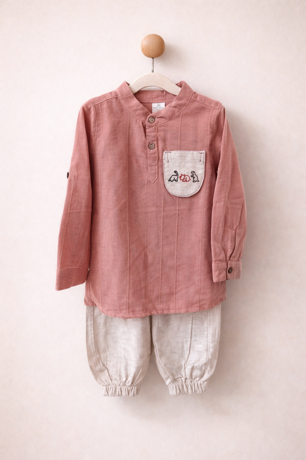 Een stoere, luchtige set van 100% katoen, met een oranje blouse met een schattig dinosaurusborduurwerk en een beige broek.