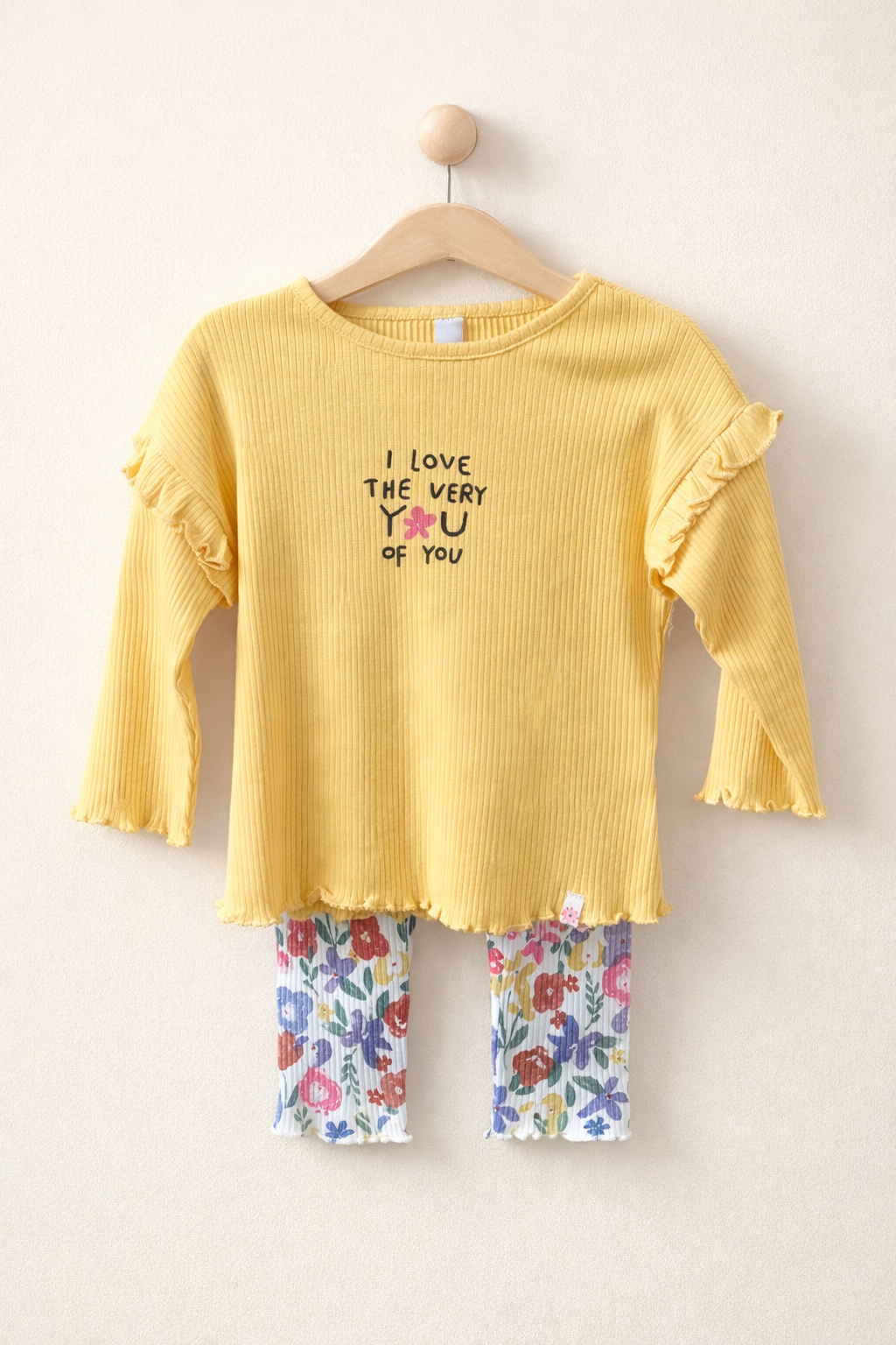 Zachte ribtop met ruches, gecombineerd met een kleurrijke bloemenlegging. Comfortabel, vrolijk en perfect voor elke dag. Gemaakt van 96% katoen en 4% elastaan.