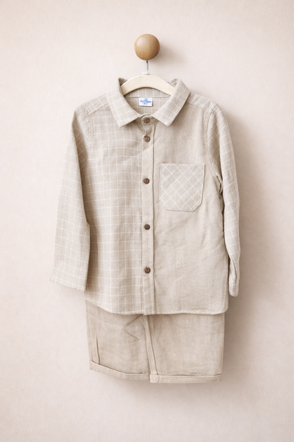 Een stoere, comfortabele set van 100% katoen, bestaande uit een lichtgroene blouse met ruitdetail en bijpassende broek.