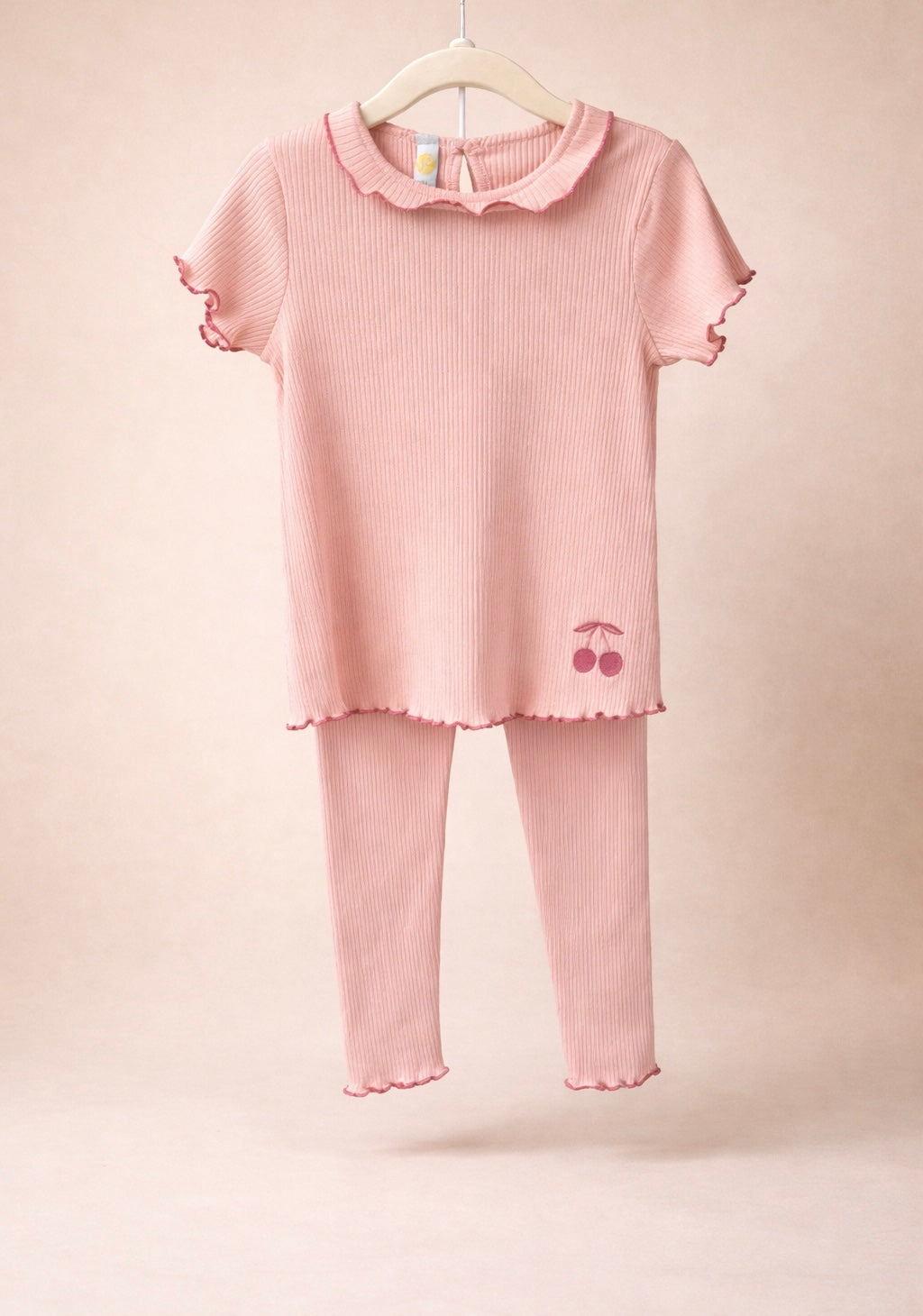 Zachte ribset met top en legging met subtiele kersenborduursels. Comfortabel, stretchy en perfect voor elke dag.