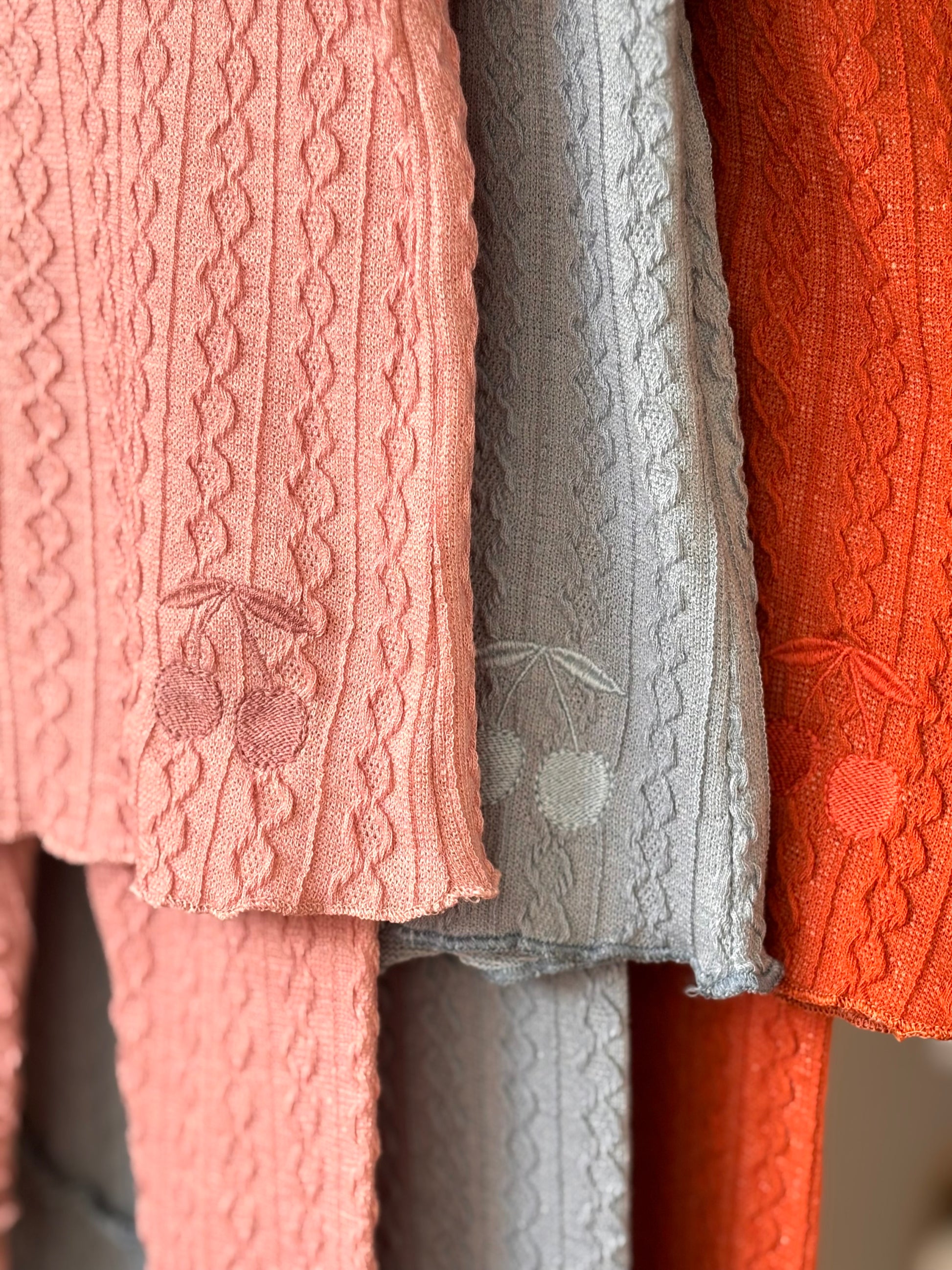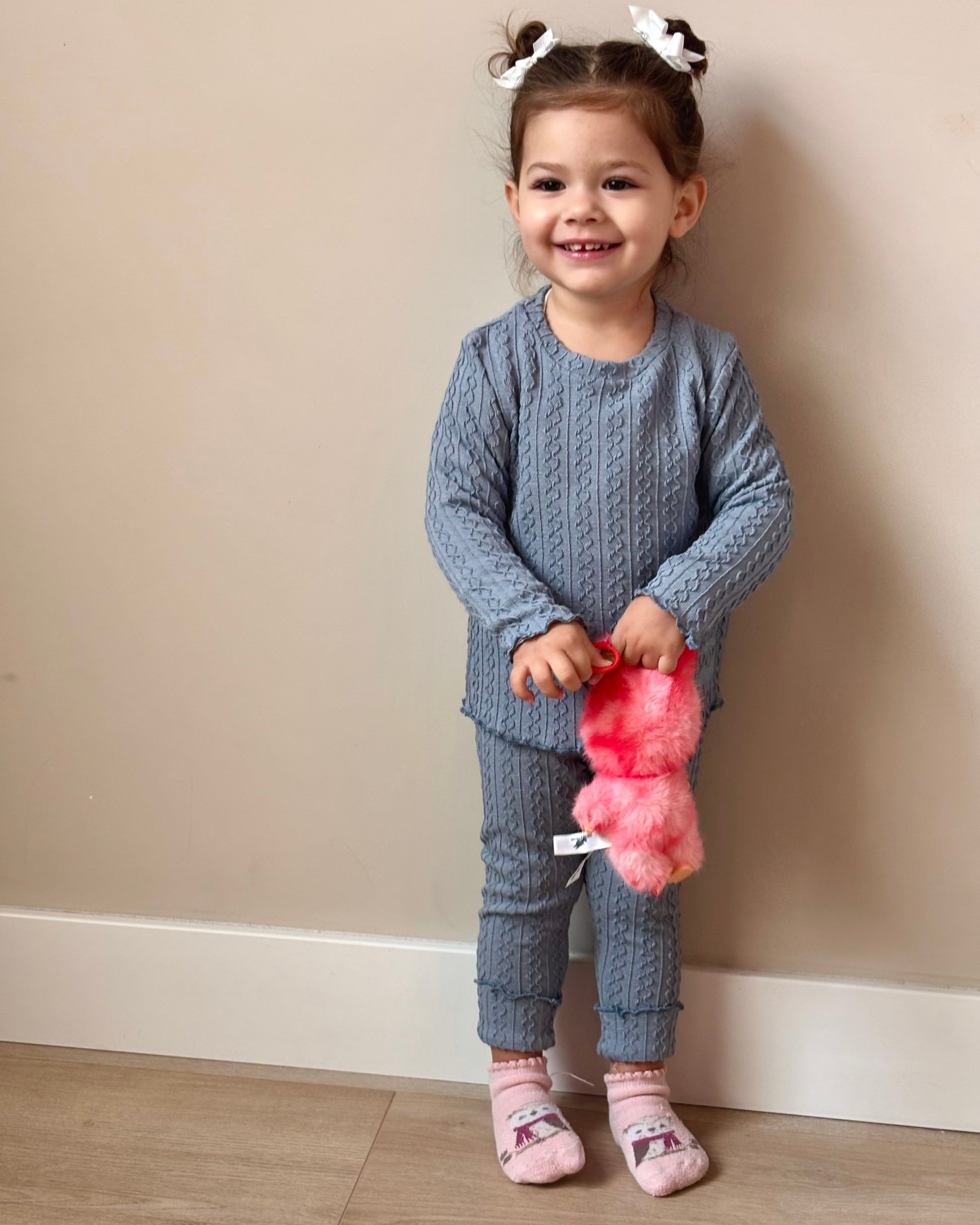Set Sue is een lieve, zachte kabelset die heerlijk zit. Ideaal voor speel­dagen én cozy dagen thuis.